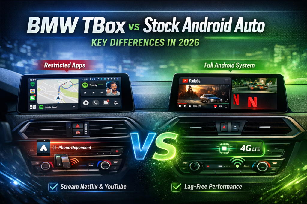 BMW i3 aracınızda Android Auto eksikliği mi çekiyorsunuz? iDrive sistemi sadece Apple CarPlay ile sınırlı olsa da, BMW TBox (MMB Kutusu) kesin ve güvenli bir çözüm sunar. Aracınızın garantisini bozmadan ve kablo kesmeden YouTube, Waze ve Spotify’ı orijinal ekranda nasıl kullanacağınızı öğrenin. EV şarj bekleme sürelerini eğlenceye dönüştürün.
